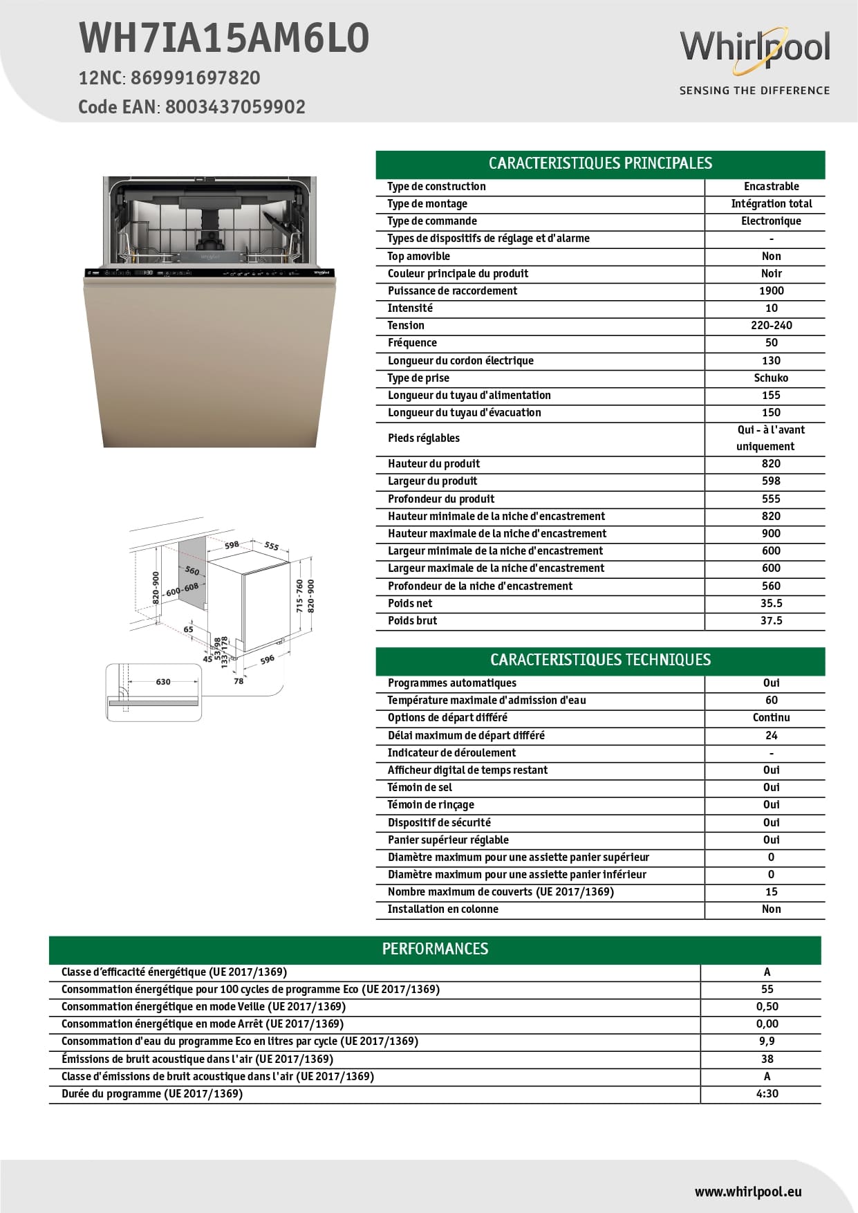 15 couverts - 38 décibels - Énergie A